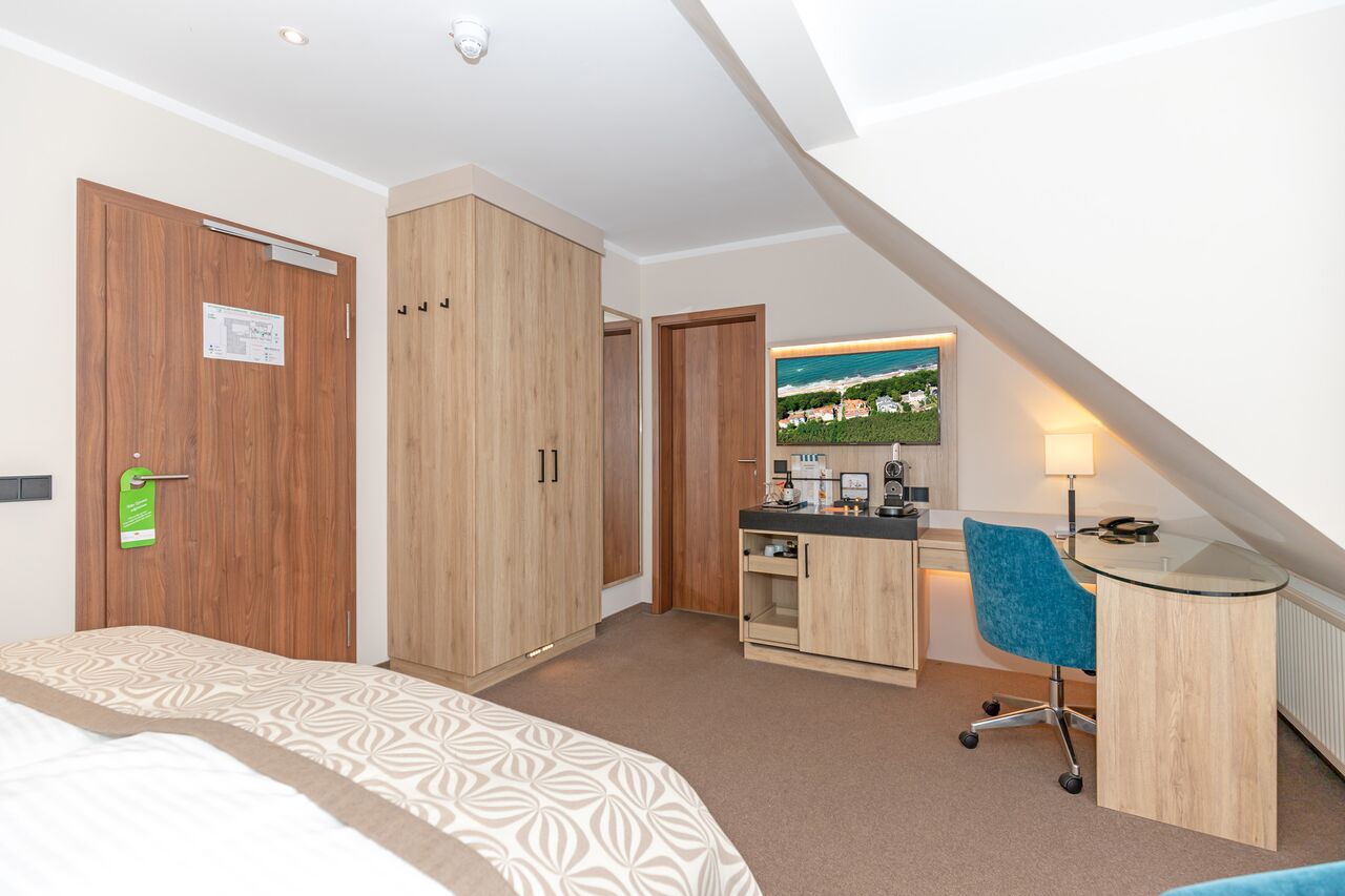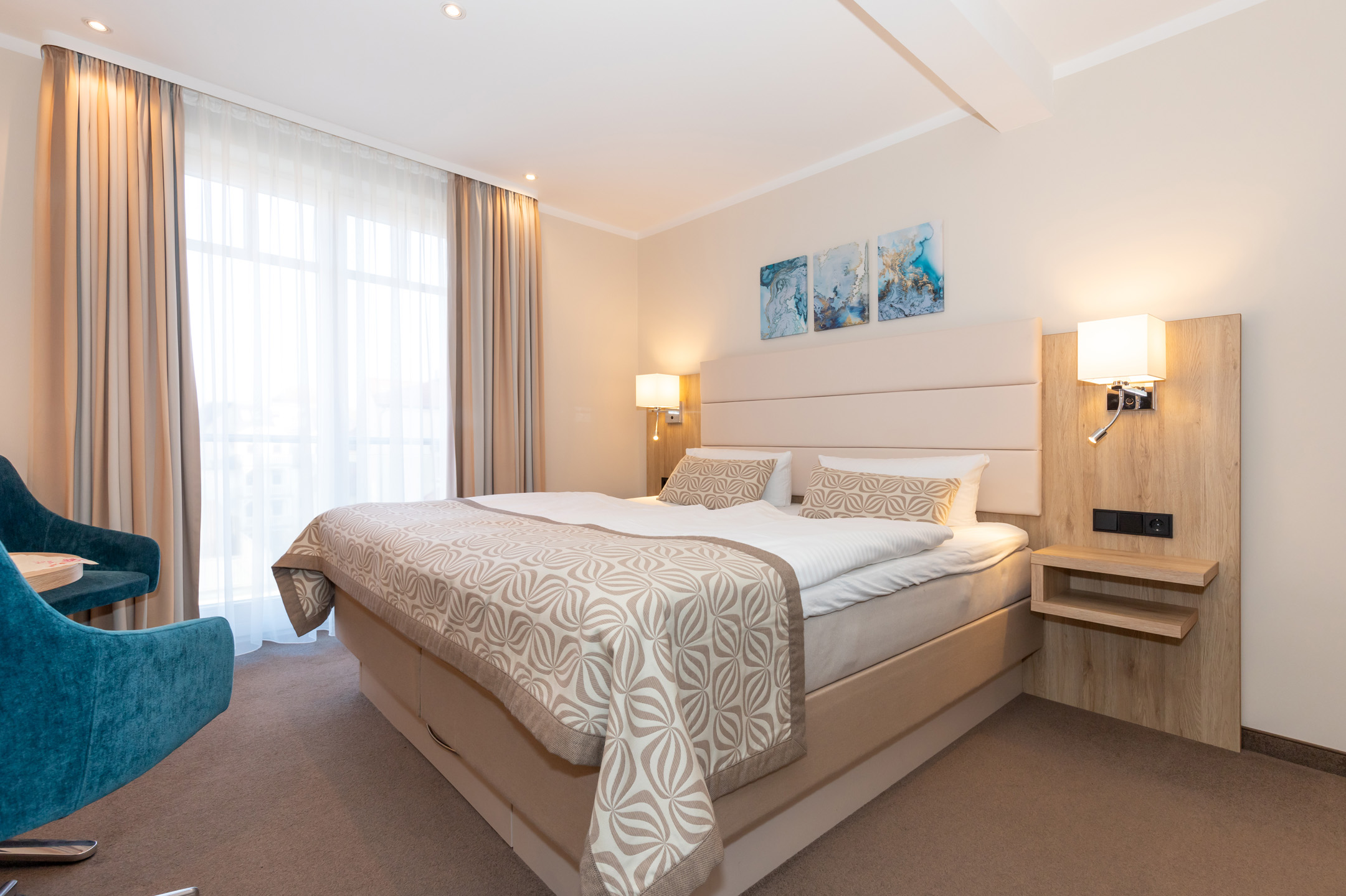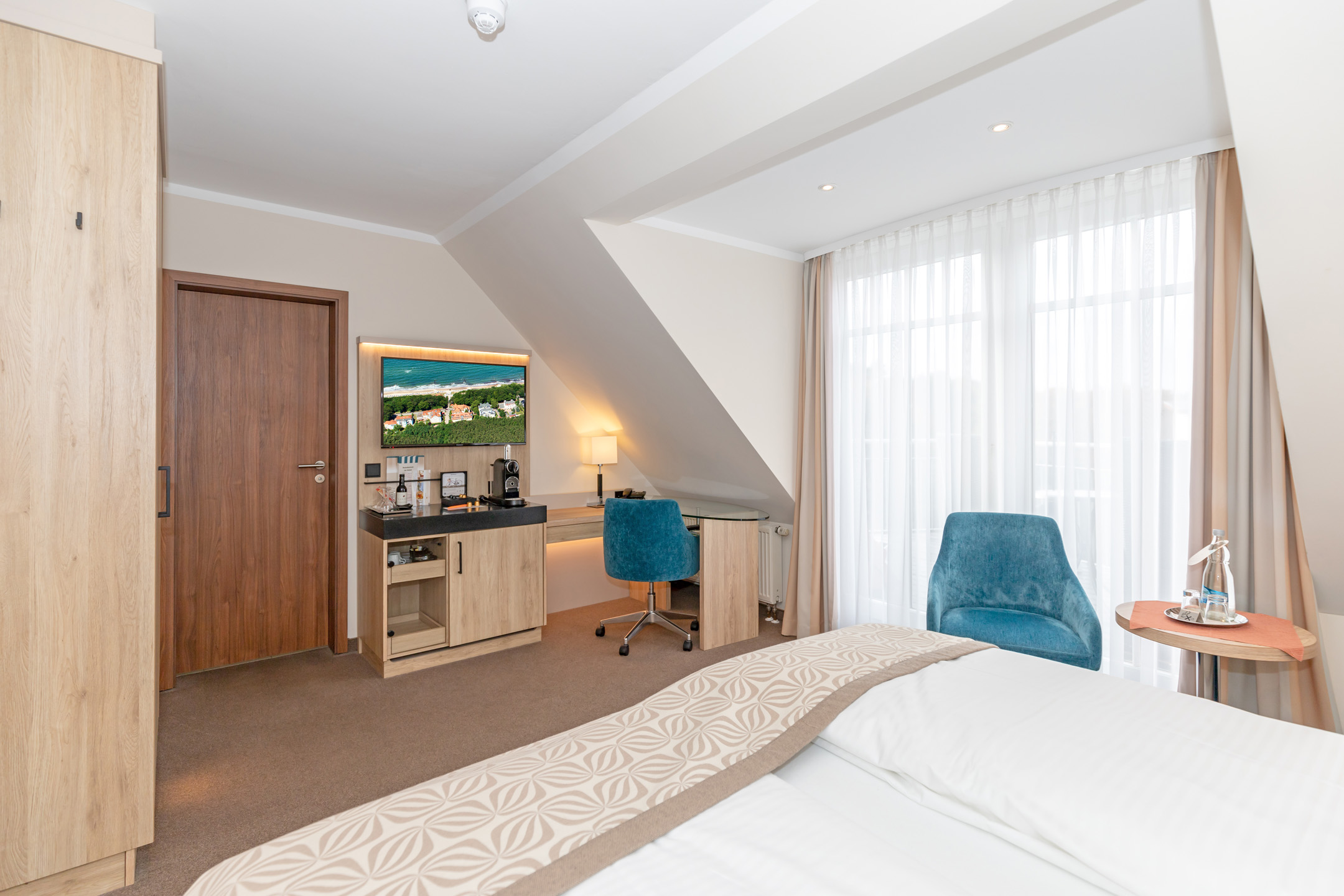 Kompaktes Smart-Doppelzimmer mit Balkon oder Terrasse – ideal für Gäste, die modernen Komfort und frische Ostseeluft schätzen.