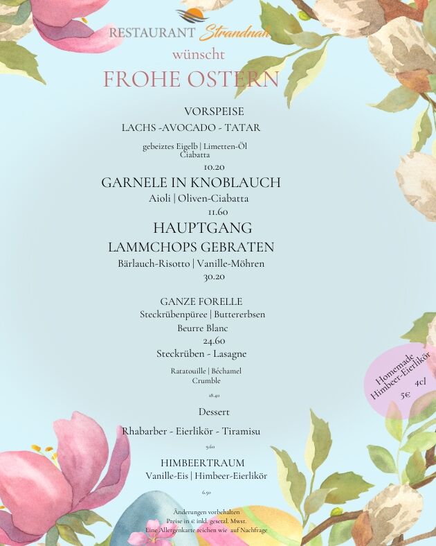 Genießen Sie die Osterfeiertage bei uns im Restaurant Strandnah - mit frischer Ostseeluft, entspannter Atmosphäre und einer besonderen Osterkarte.